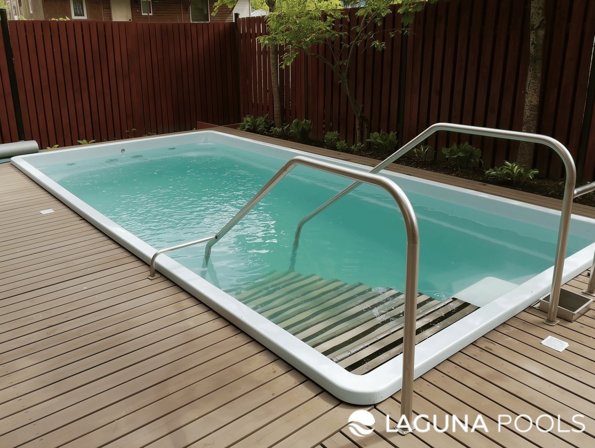 Прямоугольный бассейн с белой чашей и металлическими поручнями на деревянной террасе