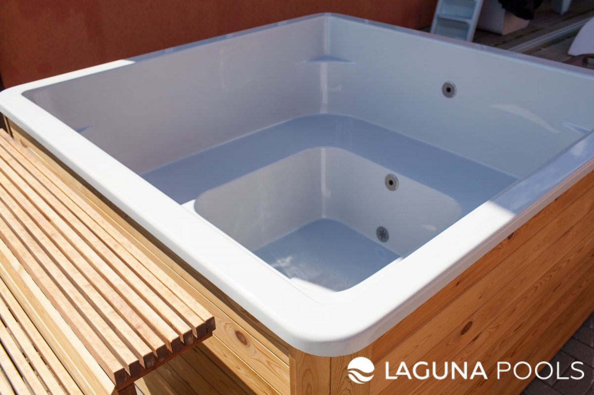 Квадратная джакузи из акрила с корпусом из светлого дерева на улице